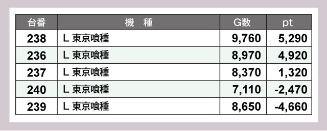 さらに『L 東京喰種』は5台中3台がプラスと盛況で、プラスとなった3台すべてが4桁ptを獲得していた。