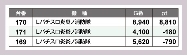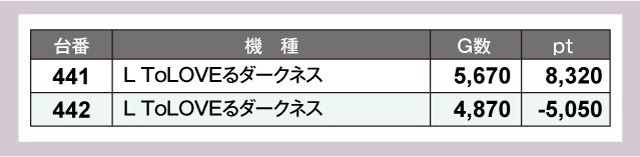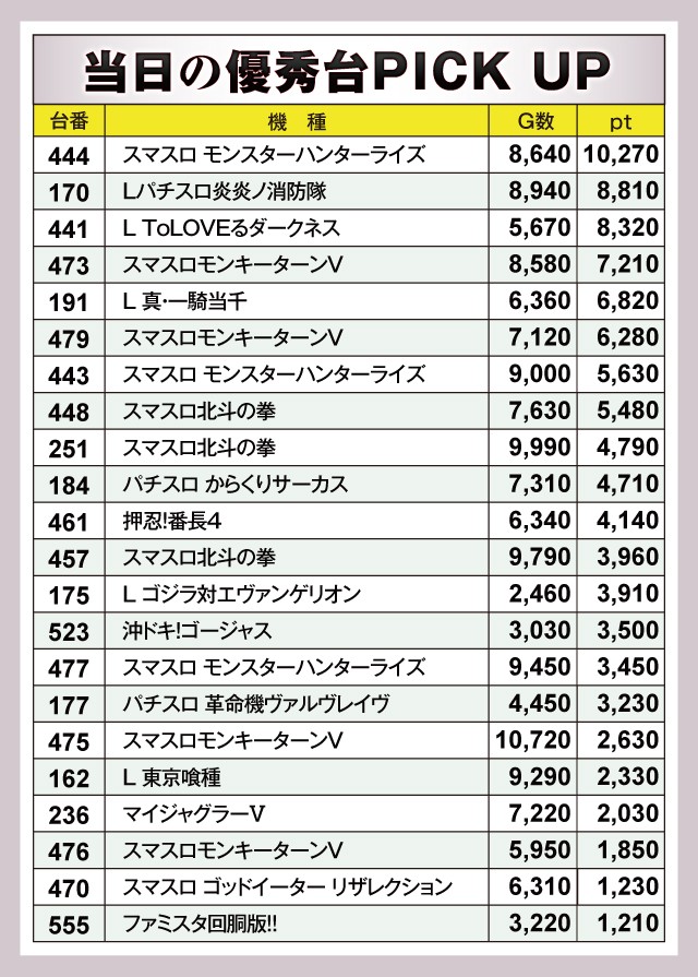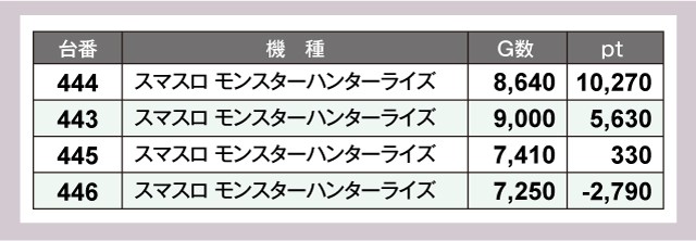 この日は444番台『スマスロ モンスターハンターライズ』が1万ptオーバーを達成!次いで『Lパチスロ炎炎ノ消防隊』や『L ToLOVEるダークネス』などが+8,000ptオーバーと素晴らしい結果を残している。