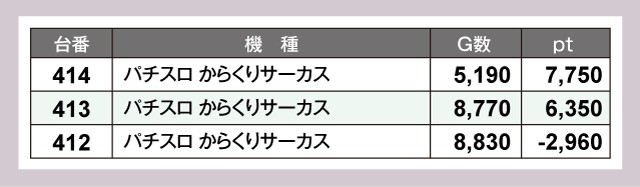 『パチスロ からくりサーカス』も414番台+7,750pt、413番台+6,350ptと絶好調で、プレイヤーたちを心から楽しませていた。