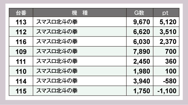 『スマスロ北斗の拳』は8台中6台がプラスで、113番台は+5,120ptの活躍で周囲の視線を集めていた。