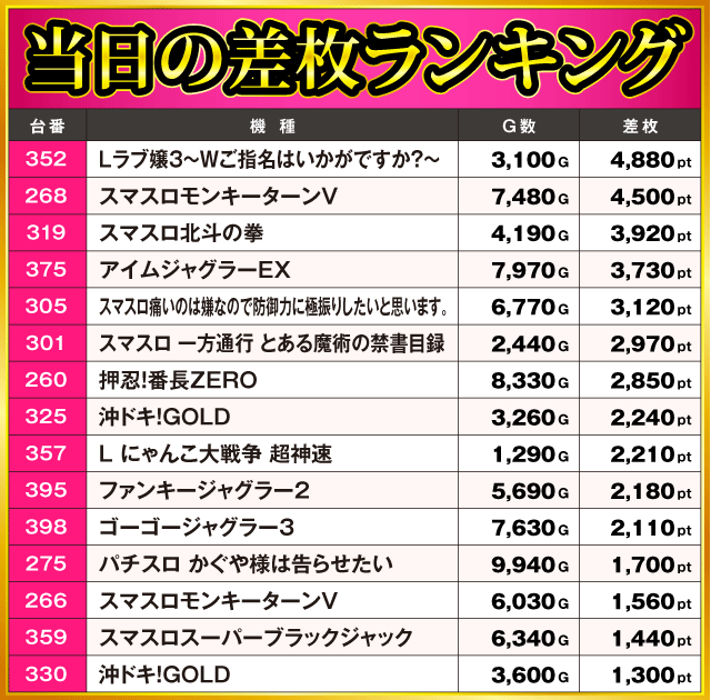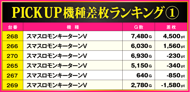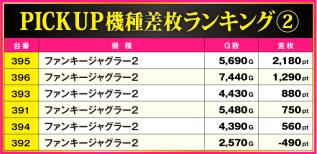 今回のPICK UP機種は全3機種で、ランキング上位台以外からも数々のハイスコアが確認されている。また、最終的に3機種トータルの全17台中9台がプラス差枚となる見事な結果を残しているだけに、ファンにとっては充実の一日となったのは間違いないだろう。