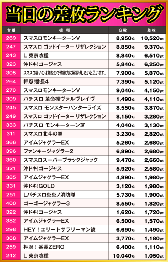 当日の差枚ランキング