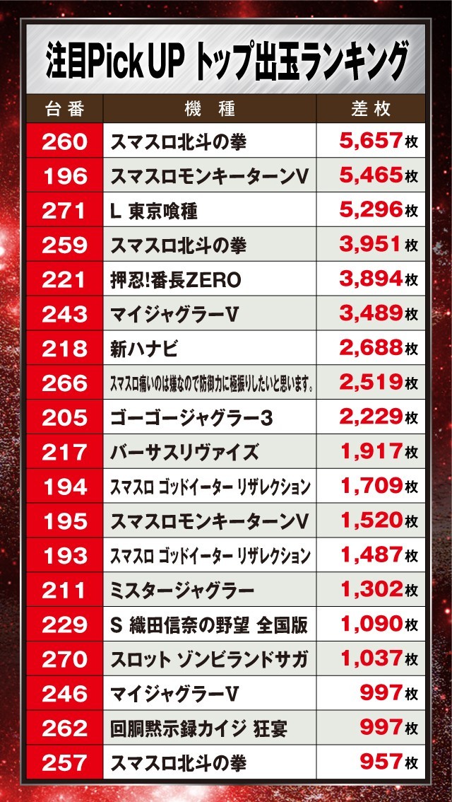 この日の店内状況をチェックすると、『スマスロ北斗の拳』と『スマスロモンキーターンV』、さらには『L 東京喰種』で+5,000枚超が発生。人気のスマスロを中心にハイスコアが続出し店内を盛り上げていた。
