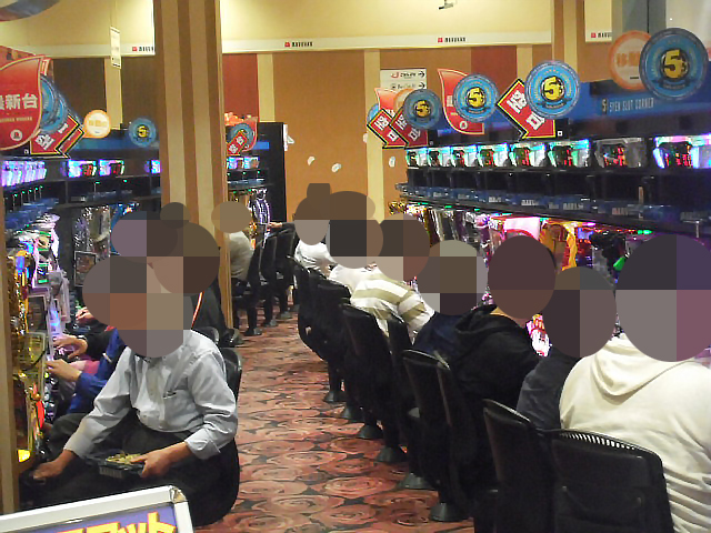 5円パチスロに目を向けると、多種多様な機種がひしめきあっている。隣り合ったプレイヤーが機種ごとに異なるゲーム性を楽しんでいるような状況で、それぞれが満足感を得られているようにうかがえた。
