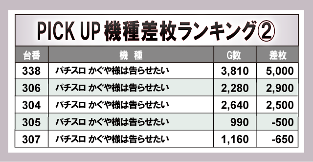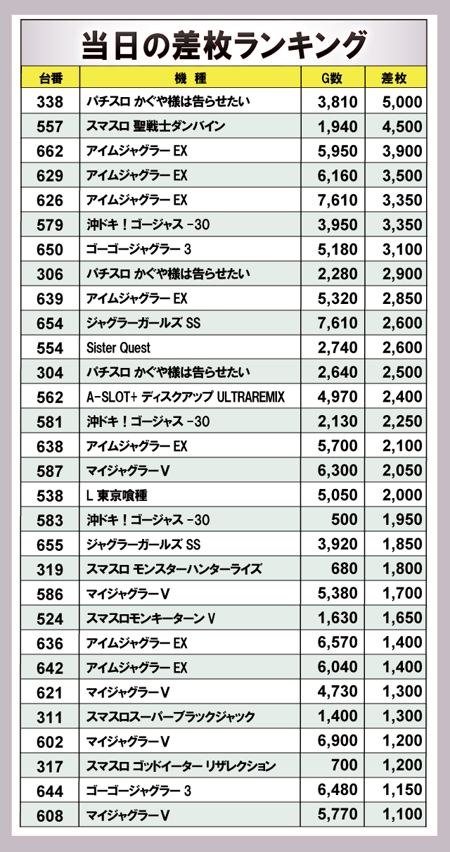 まずは当日の差枚ランキングを見てみよう。今回トップを飾ったのが『パチスロ かぐや様は告らせたい』で+5,000枚をマーク!次点で『スマスロ 聖戦士ダンバイン』で+4,500枚を獲得し、店内の盛り上がりに大きく貢献していた。その他のランクイン機種を見てみると『ジャグラー』シリーズが複数ランクインしており、幅広い機種が活躍していたと窺える!
