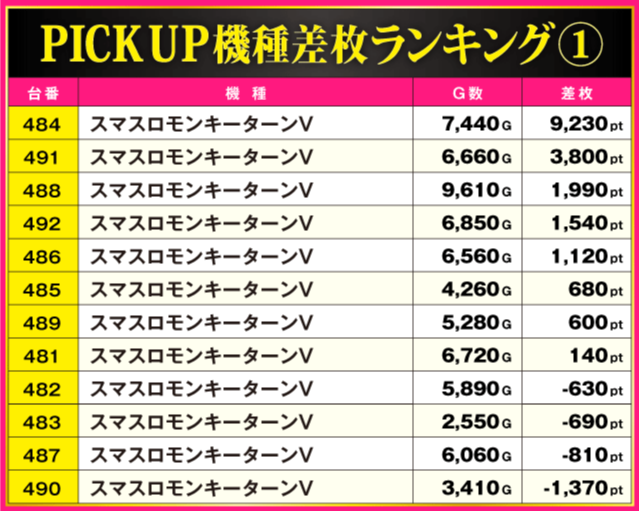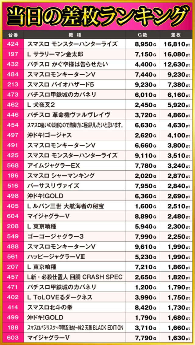 この日、特に目立っていたのが『スマスロ モンスターハンターライズ』と『L サラリーマン金太郎』で、ともに怒涛の+16,000pt超を記録する勢いを見せプレイヤーの注目を集めいていた。さらに、『パチスロ かぐや様は告らせたい』も万枚超を達成しており、ベスト3が実にハイレベルな結果を残す一日となった。
