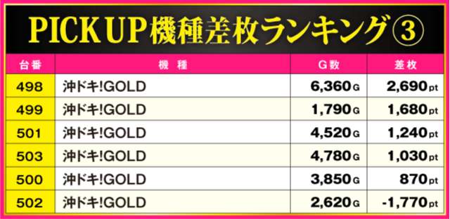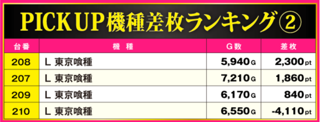 次にPICK UP機種をチェックしていこう。『スマスロモンキーターンV』では万枚目前の+9,230ptを確認。また、『L 東京喰種』は全4台中3台、『沖ドキ!GOLD』は全6台中5台がプラス差枚となっているだけに、各シマは常に活気とファンの笑顔で溢れ返っていた。