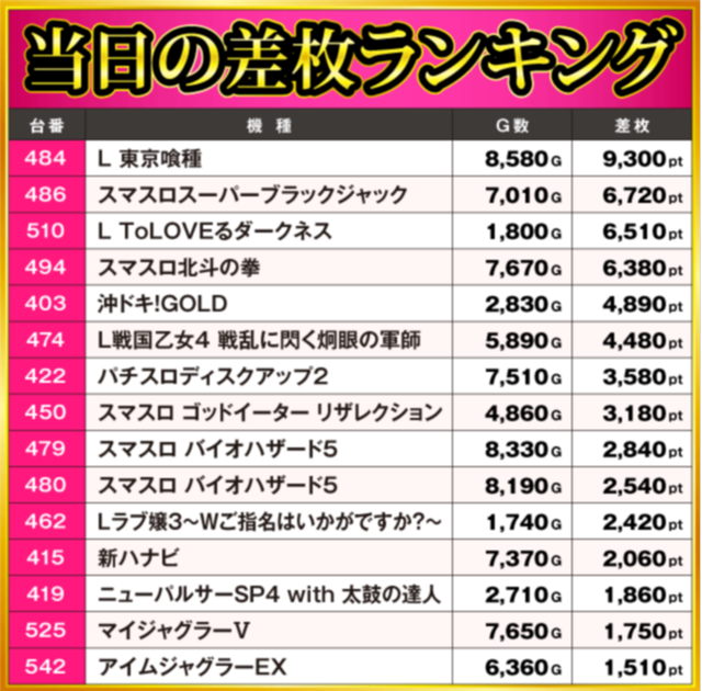この日は、人気のスマスロを中心に好調台を多数確認。そんな中、『L 東京喰種』が万枚目前の+9,300ptを叩き出しランキングトップに輝いた。また、その他にも『スマスロスーパーブラックジャック』や『L ToLOVEるダークネス』、『スマスロ北斗の拳』で+6,000pt超が確認されている。