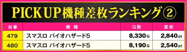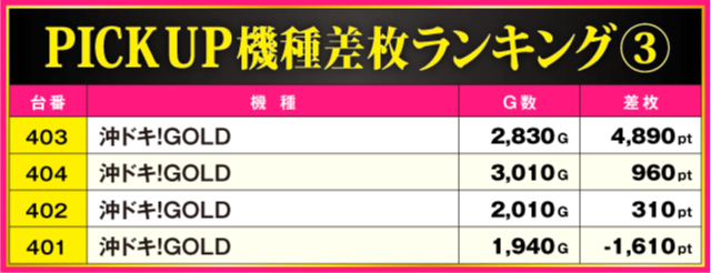 今回のPICK UP機種は全3機種。『沖ドキ!GOLD』からは+4,890pt、『スマスロ バイオハザード5』からは+2,000pt超が2台発生している。さらに、3機種トータルの全8中6台がプラス差枚となっているだけに、ファンにとっては充実の一日になったのは間違いないだろう。
