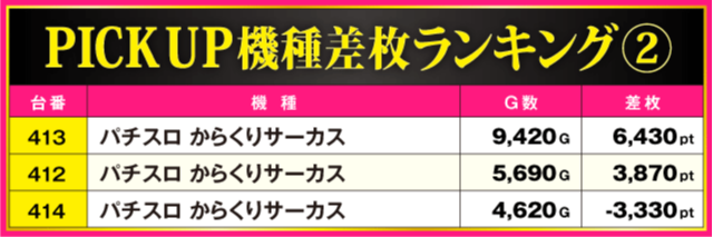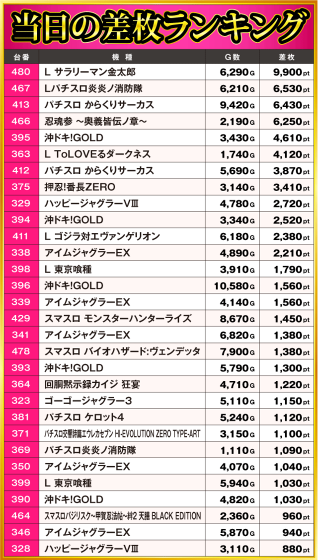 この日は、人気のスマスロを中心に様々な機種で好調台を確認。そんな中、『L サラリーマン金太郎』が万枚目前の+9,900ptを記録しランキングトップに。次いで、『Lパチスロ炎炎ノ消防隊』と『パチスロ からくりサーカス』、さらには『忍魂参 ~奥義皆伝ノ章~』が+6,000pt超を記録している。