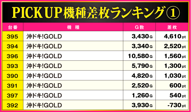 続いて、PICK UP機種の状況をチェックすると、『沖ドキ!GOLD』からは+4,610ptが発生。また、『パチスロ からくりサーカス』は全3台中2台がプラス差枚となっている。そして、『L 東京喰種』は全2台がどちらもプラス差枚で終了する盛況ぶりを見せファンを喜ばせていた。