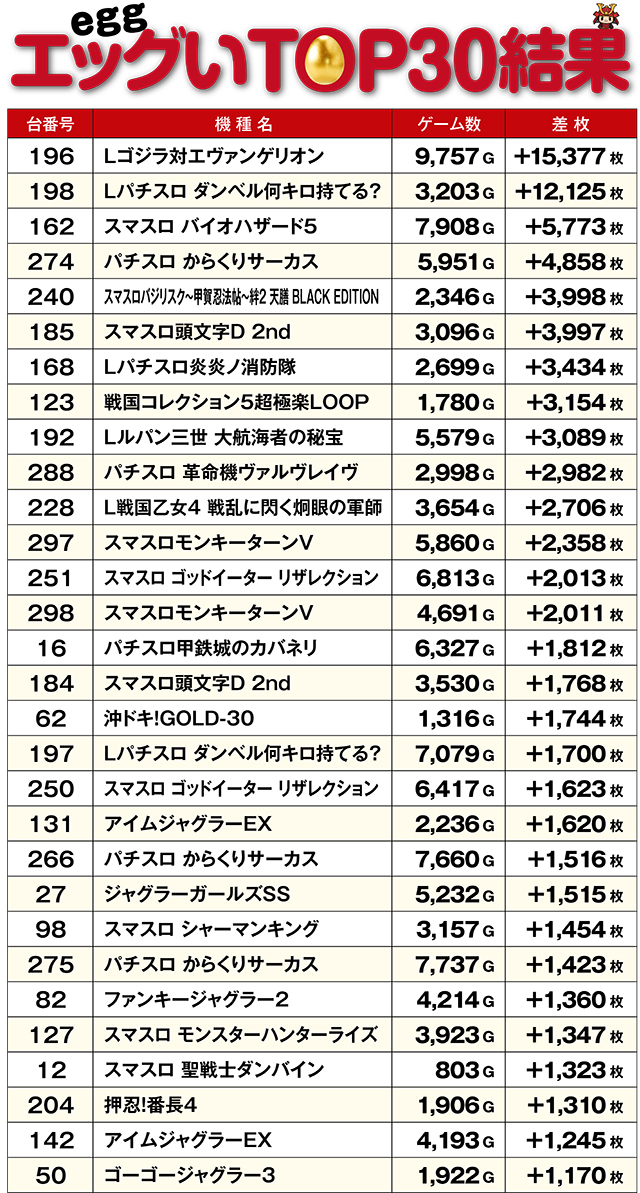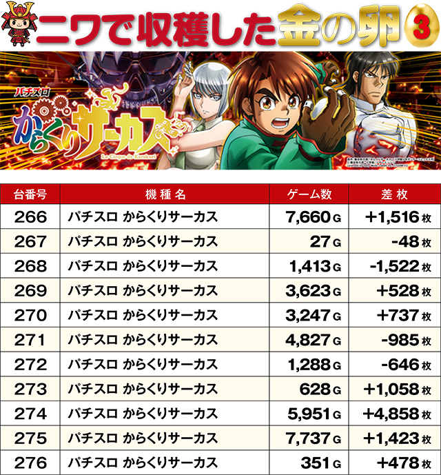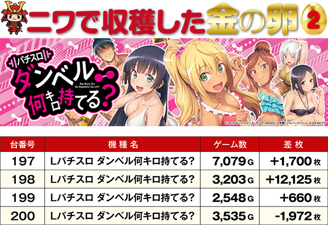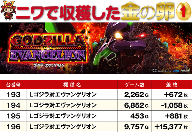 ほぼ毎回10,000枚超えレコードを生み出すニワ獲り合戦の日だけあって、今回も2台の12,000枚超えが誕生!注目は全台プラスに限りなく近いポジションにあった『Lゴジラ対エヴァンゲリオン』&『Lパチスロ ダンベル何キロ持てる?』。さらに『パチスロ からくりサーカス』も半数以上の台が優秀挙動を見せていた!