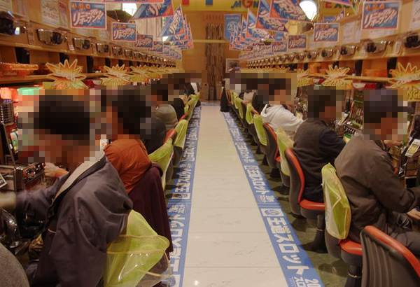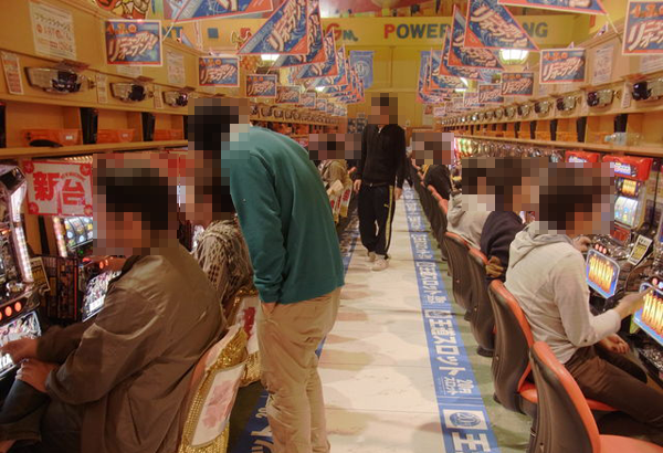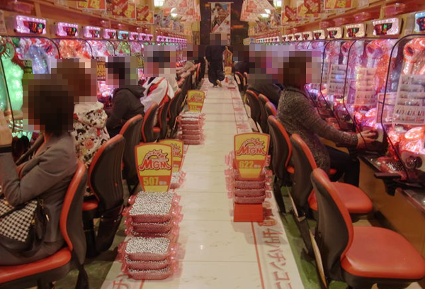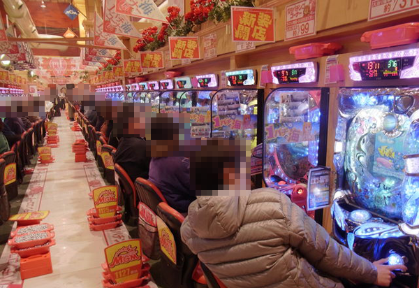 取材中に最も盛り上がっていた午後には、4円パチンコの「ぱちんこCR北斗の拳6 拳王」や「パチンコCR貞子3D」など多数のシマが満席となった。