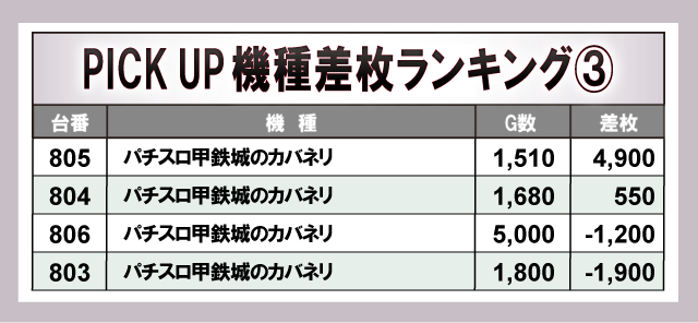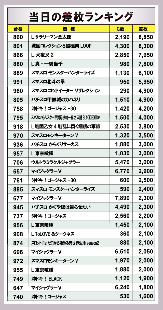 『L サラリーマン金太郎』の+8,850枚を筆頭に『戦国コレクション5超極楽LOOP』や『L 犬夜叉2』など+5,000枚OVERの台が複数発生している!その他でもランキングに掲載されている台のほとんどが+2,000枚OVERとなっており、非常に盛り上がっていたことが窺える内容だ!