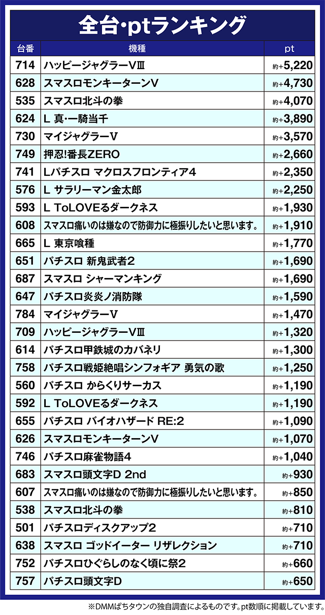 「L 真・一騎当千」の624番台や「マイジャグラーⅤ」の730番台も約+3,500pt以上となるなど、多彩な機種がにぎわいをみせた。