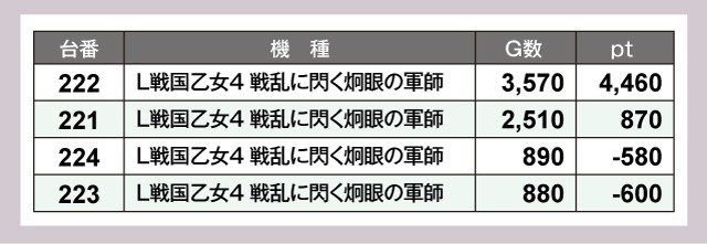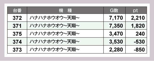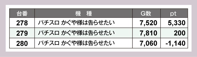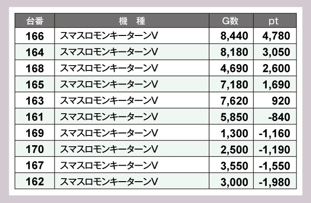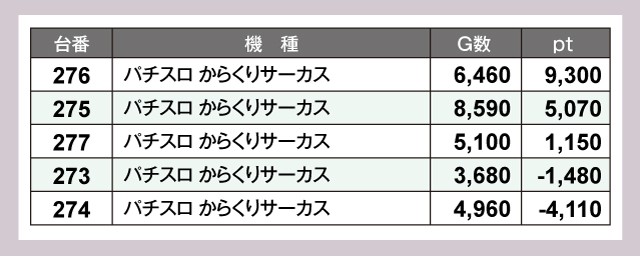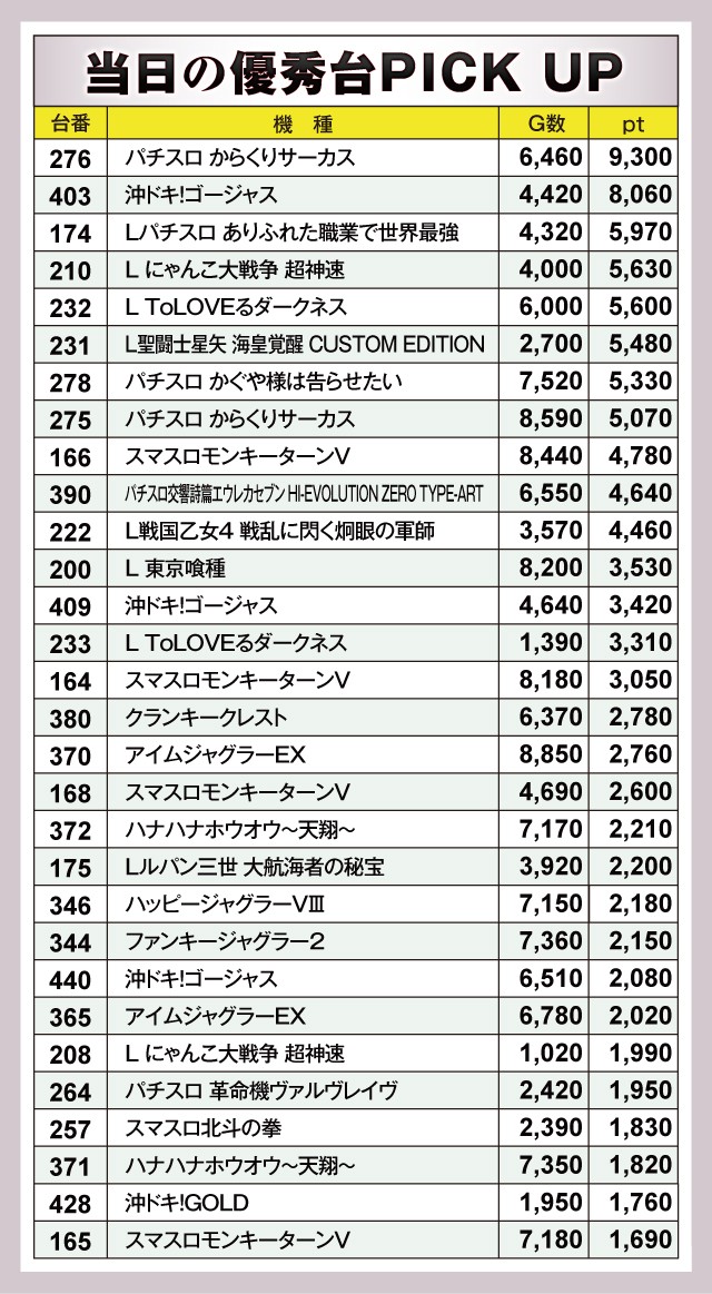 この日は276番台『パチスロ からくりサーカス』が+9,000ptオーバーを達成!さらに403番台『沖ドキ!ゴージャス』や174番台『Lパチスロ ありふれた職業で世界最強』も+5,000ptオーバーと圧巻のパフォーマンスを披露している。