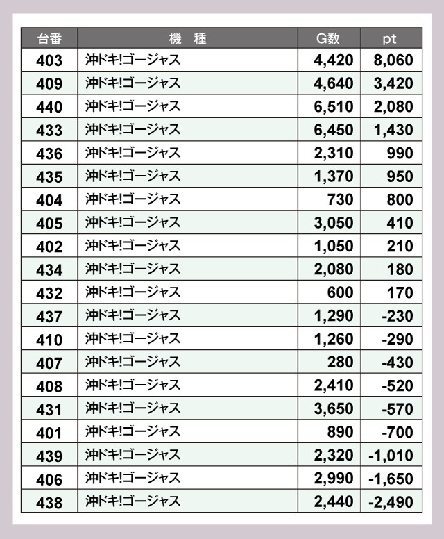 さらに設置台数の多い『沖ドキ!ゴージャス』も好評で、なかには+8,000pt超の好調台を確認している。