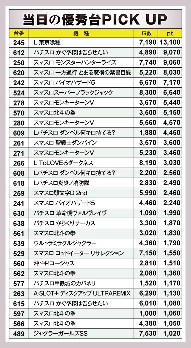 取材当日は、245番台『L 東京喰種』が+13,100ptで堂々の1位を獲得。次いで612番台『パチスロ かぐや様は告らせたい』が+9,070pt、250番台『スマスロ モンスターハンターライズ』が+9,060ptと微笑ましい状況になっていた。