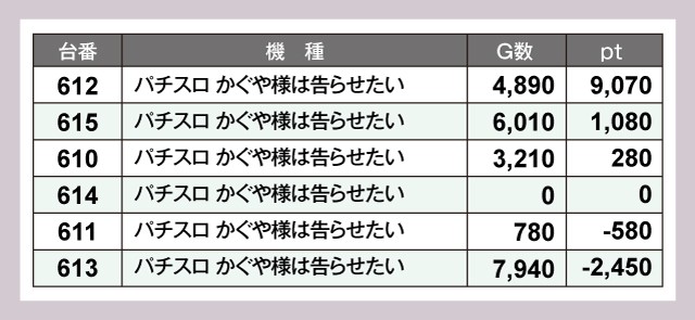 『パチスロ かぐや様は告らせたい』も大活躍。なかには+9,000ptを超える優秀台も確認できた。