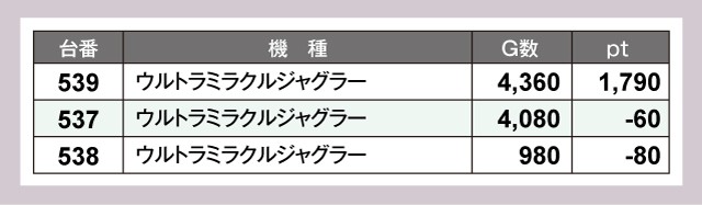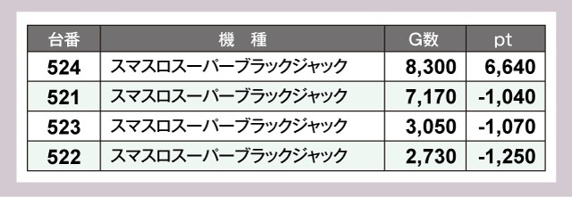 さらに『スマスロスーパーブラックジャック』やAタイプの『ウルトラミラクルジャグラー』など、スロットコーナーのあちこちに4桁pt超の優秀台が誕生していた。