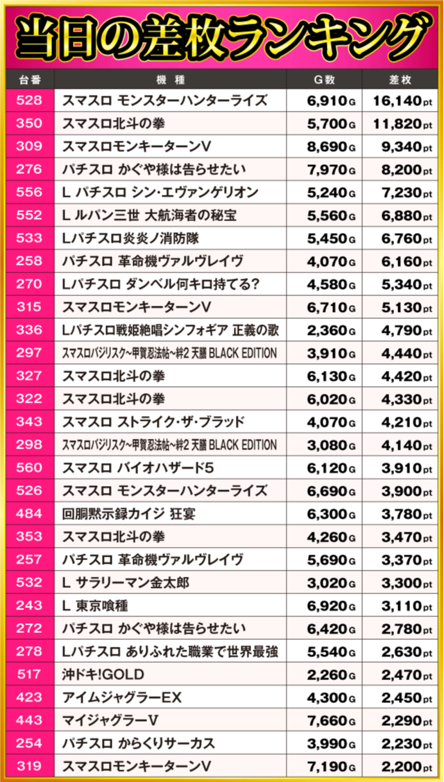 この日は、人気のスマスロを中心に好調台を多数確認。そんな中、『スマスロ モンスターハンターライズ』が怒涛の+16,140ptを叩き出し堂々のランキングトップに。続く『スマスロ北斗の拳』も万枚達成、『スマスロモンキーターンV』が+9,340ptと、ランキングベスト3が非常にハイレベルな結果を残している。