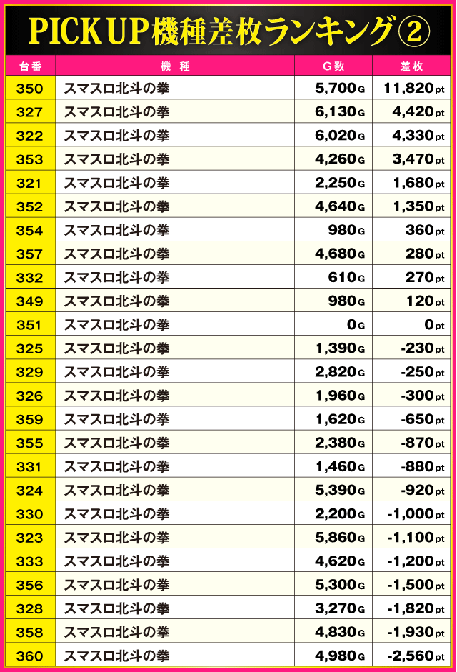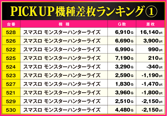 続いてPICK UP機種をチェックしてみよう。『スマスロ モンスターハンターライズ』は、ランキングトップの528番台以外にも、526番台が+3,900ptという好成績を記録。また、『スマスロ北斗の拳』もランキング上位台以外に+4,000pt超が2台も発生する勢いを見せファンを喜ばせていた。