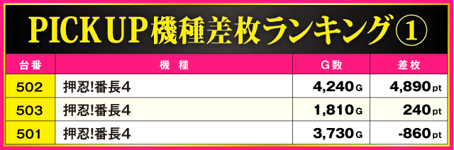 次にPICK UP機種を見てみよう。ランキング上位機種以外では『押忍!番長4』で+4,890pt、『パチスロ からくりサーカス』で+3,710ptを確認。さらに、3機種とも半数以上の台がプラス差枚で実戦を終えているだけに、それぞれのシマは常に活気に満ち溢れる一日となった。