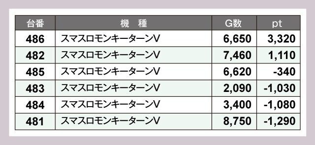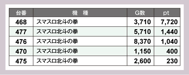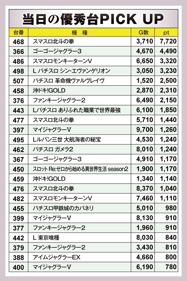この日は468番台『スマスロ北斗の拳』が+7,000ptオーバーを達成!次いで366番台『ゴーゴージャグラー3』が+4,000ptオーバー、486番台『スマスロモンキーターンV』が+3,000ptオーバーと素晴らしい結果を残している。