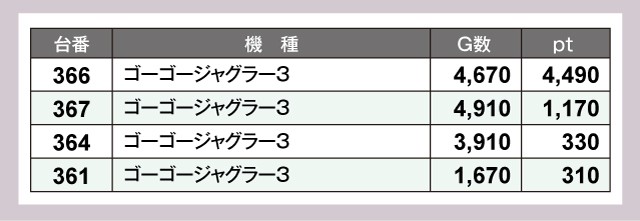 さらにAタイプの『ゴーゴージャグラー3』は4台すべてがプラスと盛況。なかでも366番台が+4,490ptと理想的な展開を迎えていた。