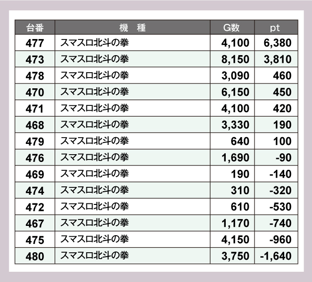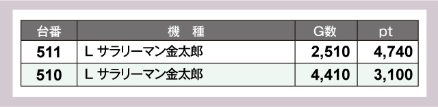 『Lルパン三世 大航海者の秘宝』494番台が+7,920ptを叩きだし、華麗にフィニッシュを決めた! 次いで『スマスロ北斗の拳』477番台が+6,380pt、『パチスロ かぐや様は告らせたい』517番台が+5,220ptと大満足の結果となっている。以下、『L サラリーマン金太郎』511番台の+4,740ptなど、優秀台がズラリと並ぶ見事な1日だった。