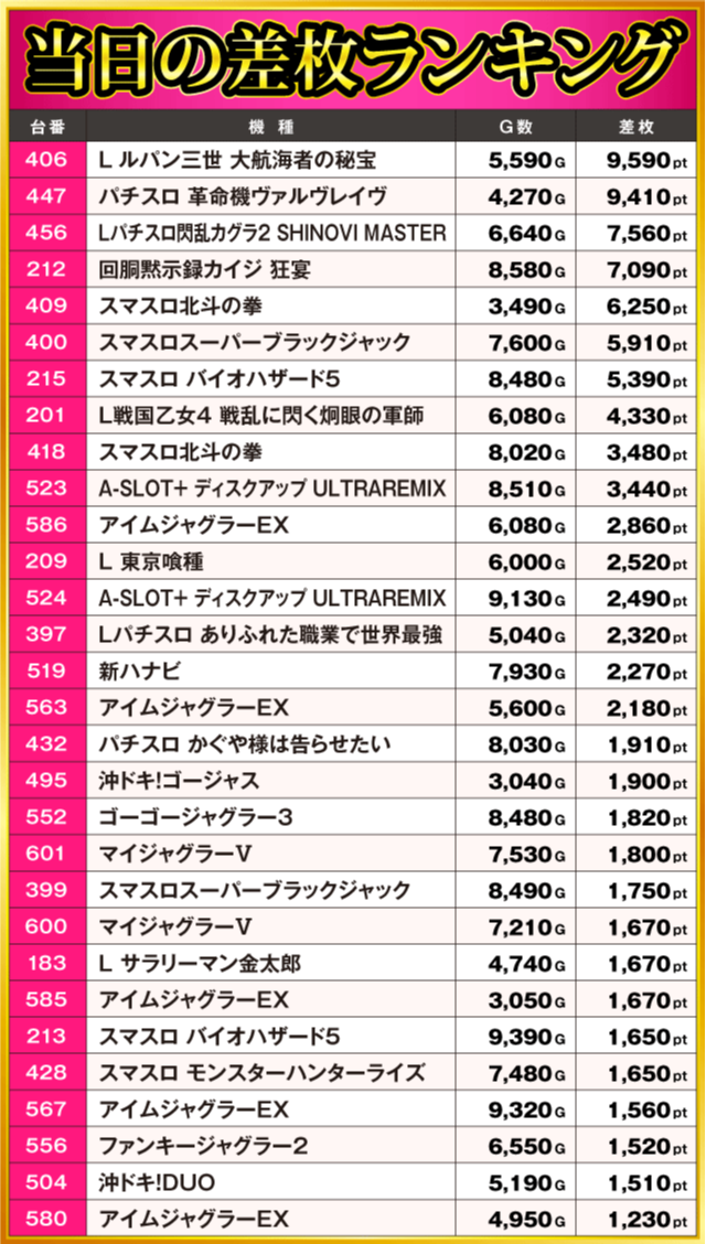 この日は、人気のスマスロを中心に好調台を多数確認。そんな中、『Lルパン三世 大航海者の秘宝』と『パチスロ 革命機ヴァルヴレイヴ』が万枚目前の+9,000pt超を記録しプレイヤーの注目を集めていた。また、導入直後の新台『回胴黙示録カイジ 狂宴』が+7,090ptを叩き出している点も注目すべきポイントと言えるだろう。