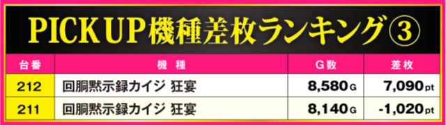 今回のPICK UP機種は全3機種。差枚上位にランクインした『回胴黙示録カイジ 狂宴』以外にも好成績が複数確認されており、最終的に3機種トータルの全6台中5台がプラス差枚で実戦を終了するという見事な結果を残しファンを喜ばせていた。