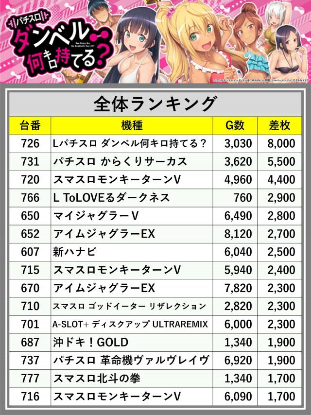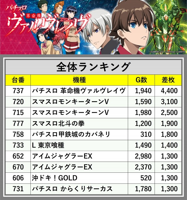 厳選された取材対象機種をはじめ、その他スロット全体から好記録が飛び出した!プレイヤーが楽しんだ1日を下記データにて振り返ってみて欲しい。