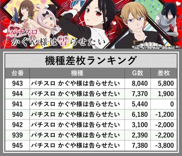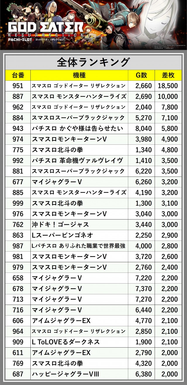 ※差枚数順に掲載しています