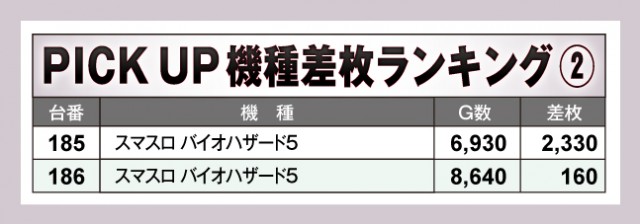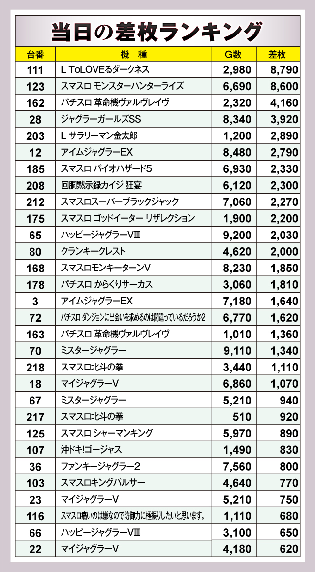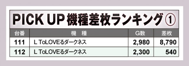 まずは差枚ランキングのチェックから。30台のうち20台が+1,000枚オーバーで、+2,000枚オーバーは12台出現。それらのなかでもっとも優秀だったのは、111番台の「L ToLOVEるダークネス」で、差枚は+6,900枚を獲得! またランクイン機種を見渡してみると、スマスロが大半を占めるなかジャグラーシリーズが複数ランクイン! ハイスペック機種からノーマルタイプまで幅広い機種にチャンスが隠されていたようだ!
