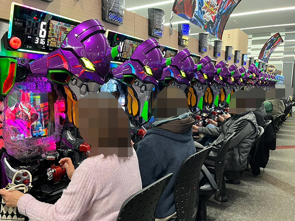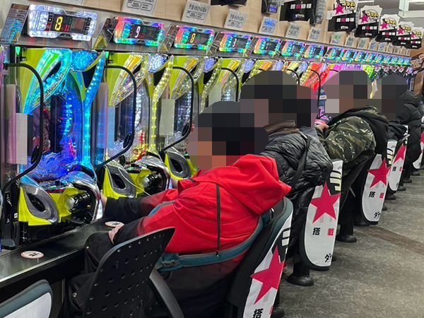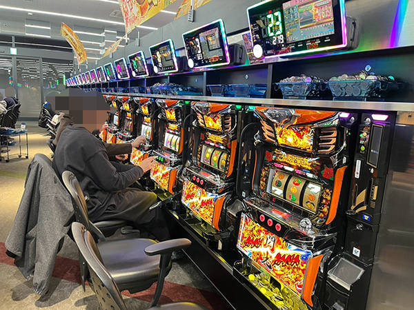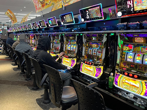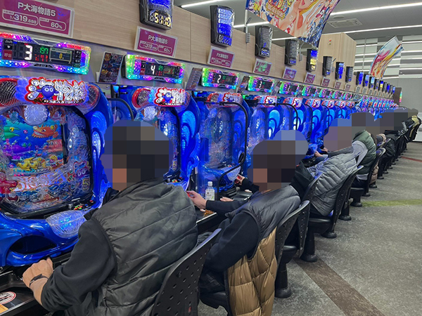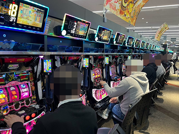 取材時は多くのプレイヤーが来店。パチンコ・パチスロともに、様々な機種が支持を得ていた。