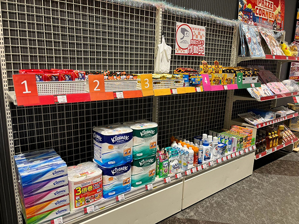 景品コーナーにはキャラクターグッズ・日用品・酒類など多彩なアイテムが揃っており、プレイヤーたちの目を引いていた。