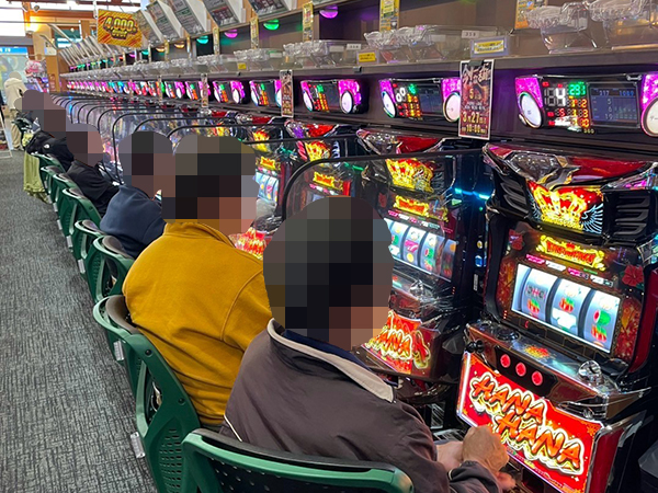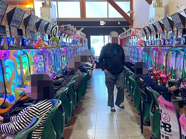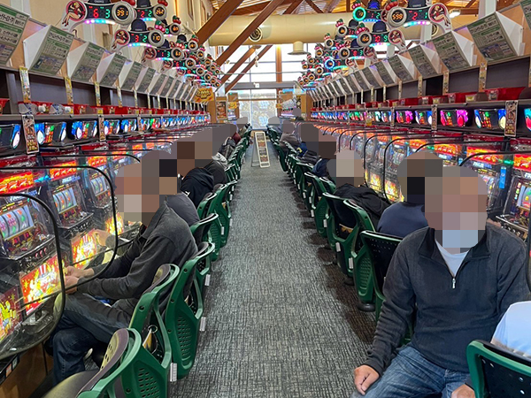 取材時は既に多くのプレイヤーが集結し、パチンコ・パチスロを問わずにぎやかな状況となっていた。