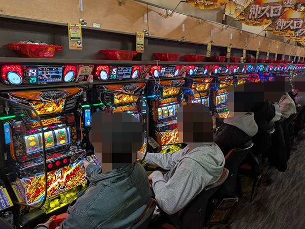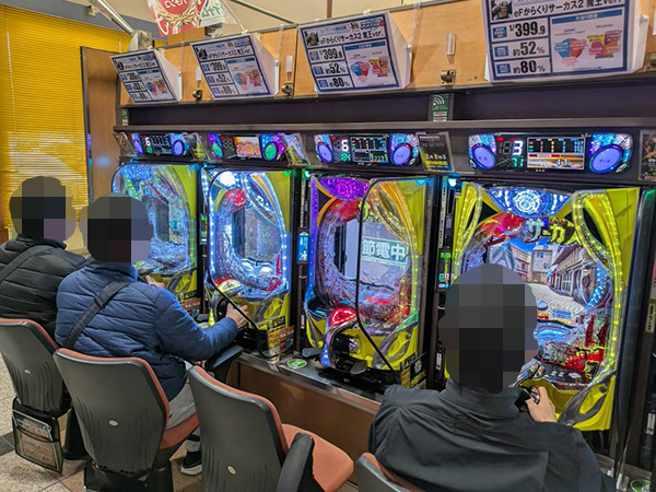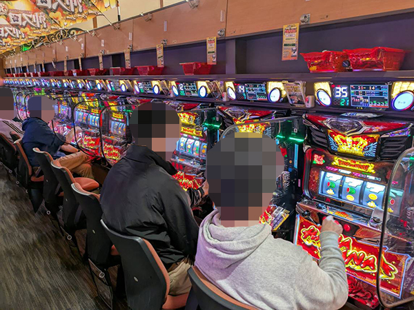 取材時は多くのプレイヤーが来店。パチンコ・パチスロともに、様々な機種が支持を得ていた。