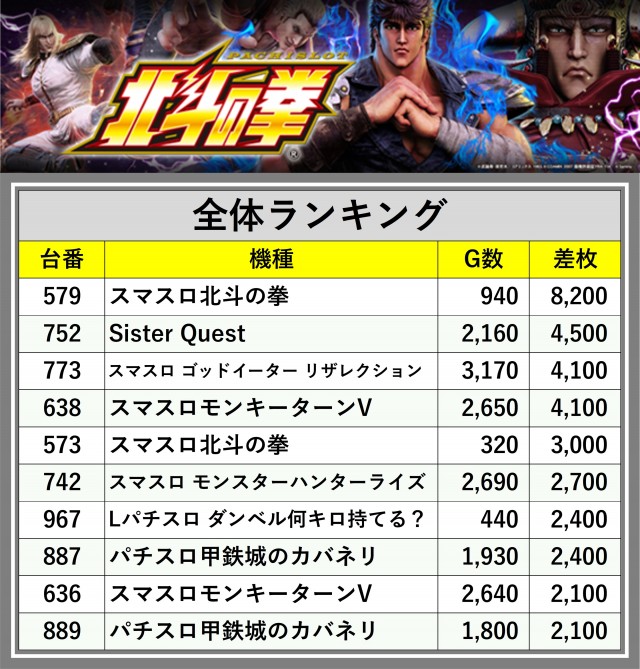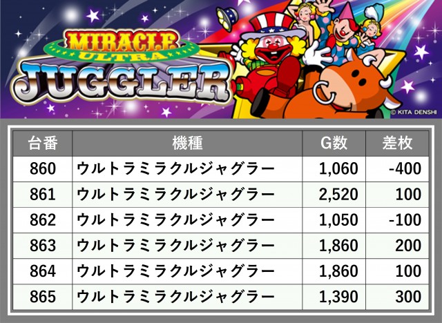 厳選された取材対象機種をはじめ、その他スロット全体から好記録が飛び出した!プレイヤーが楽しんだ1日を下記データにて振り返ってみて欲しい。