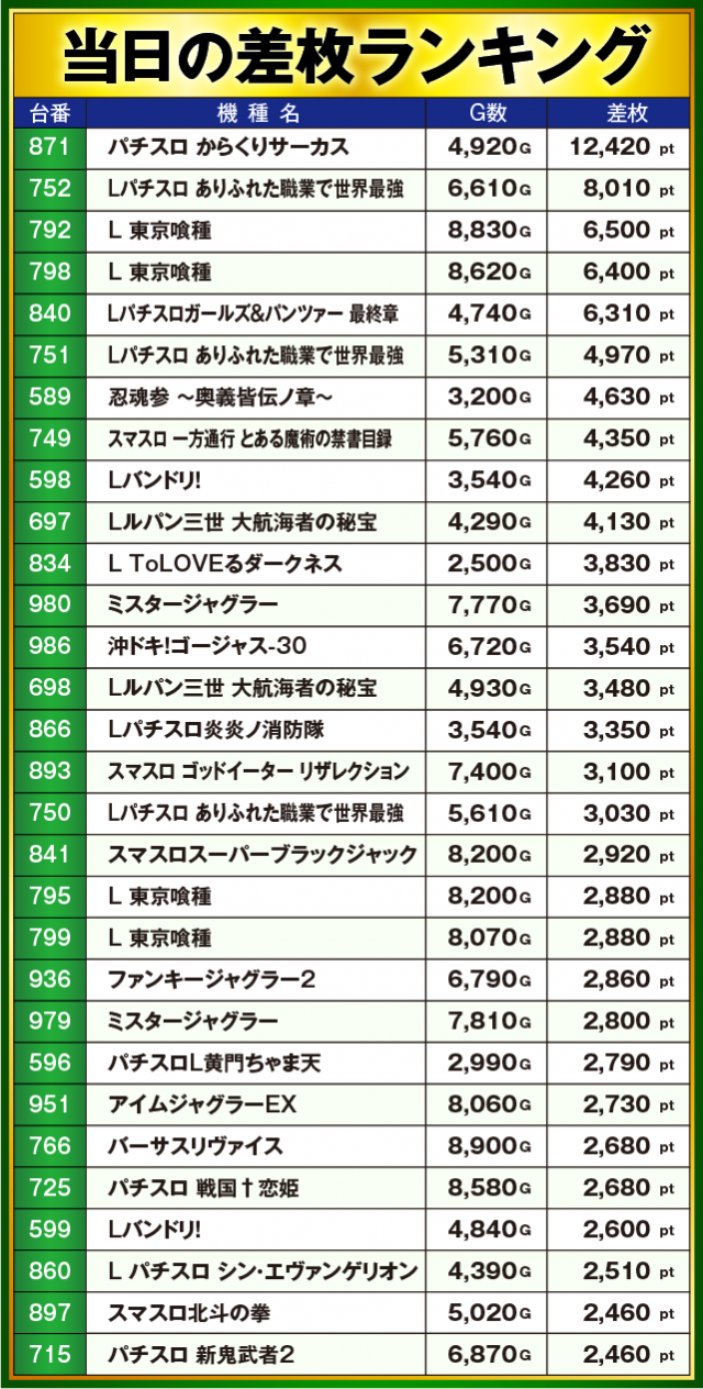 レポートの最後に「Super D’STATION金古店」の差枚ランキングも掲載!