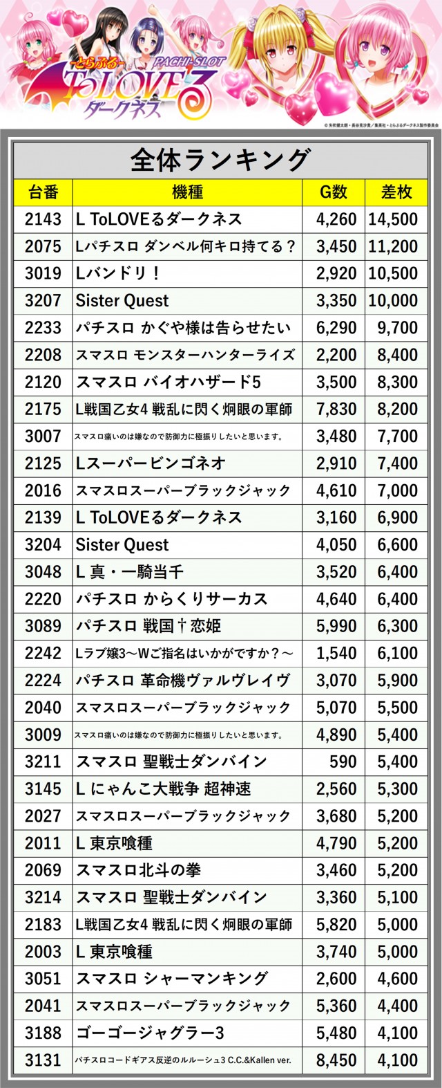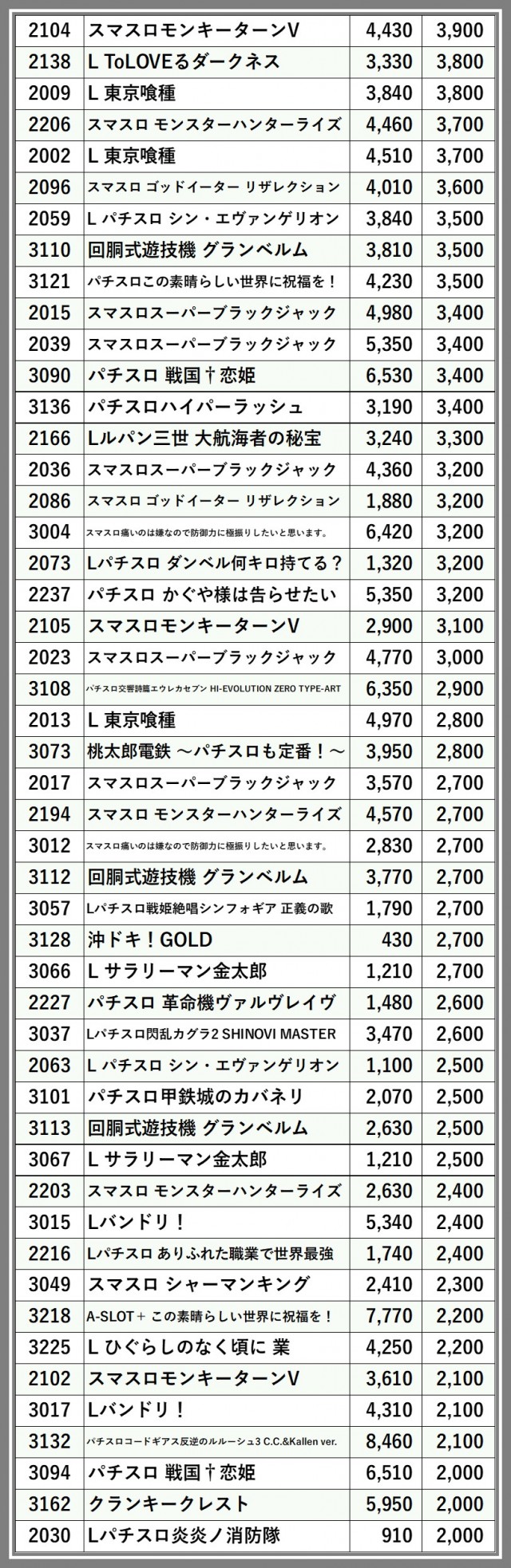 厳選された取材対象機種をはじめ、その他スロット全体から好記録が飛び出した!プレイヤーが楽しんだ1日を下記データにて振り返ってみて欲しい。