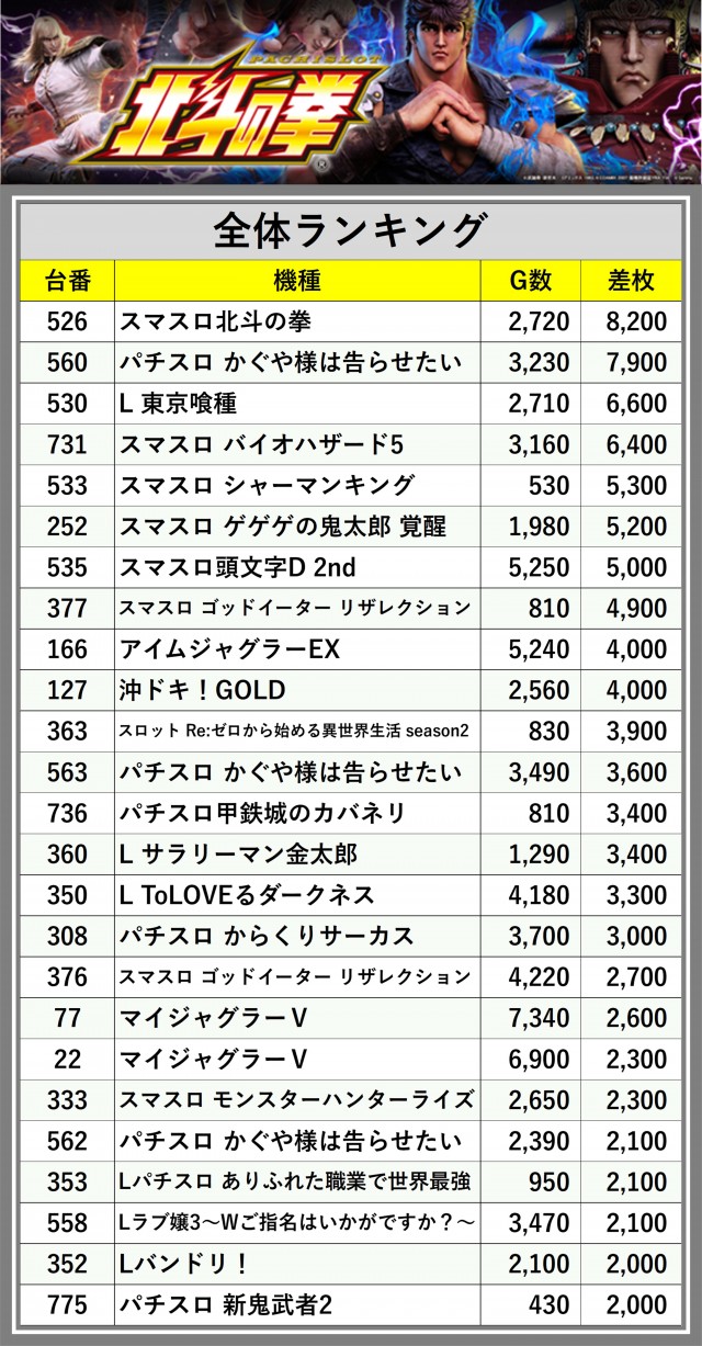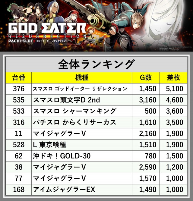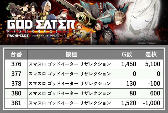 厳選された取材対象機種をはじめ、その他スロット全体から好記録が飛び出した!プレイヤーが楽しんだ1日を下記データにて振り返ってみて欲しい。