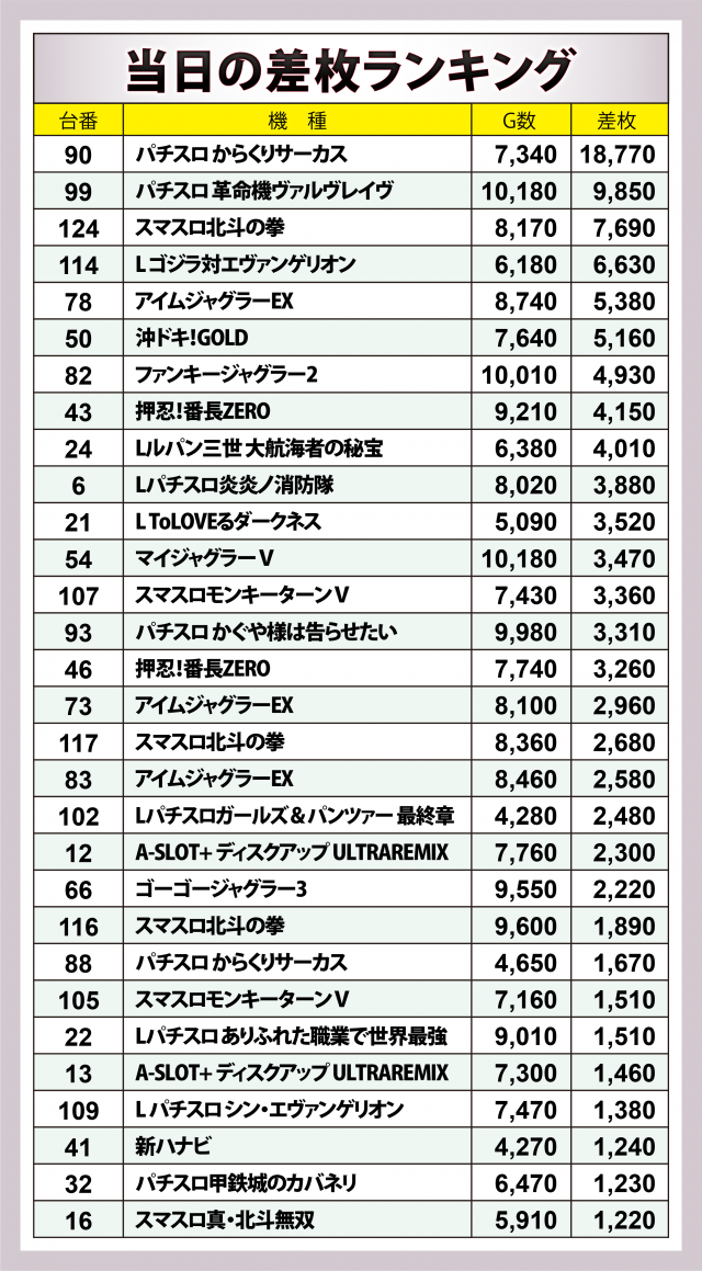 30台全てが4桁以上のプラスに成功し、+2,000枚以上は全体の7割となる21台、+3,000枚以上は全体の半数となる15台、+4,000枚オーバーは9台、+5,000枚オーバーは6台、+6,000枚オーバーは4台、+7,000枚オーバーは3台、+9,000枚オーバーは2台、そして万枚をクリアしたのは1台と、前回と遜色ないクオリティと相成った。
