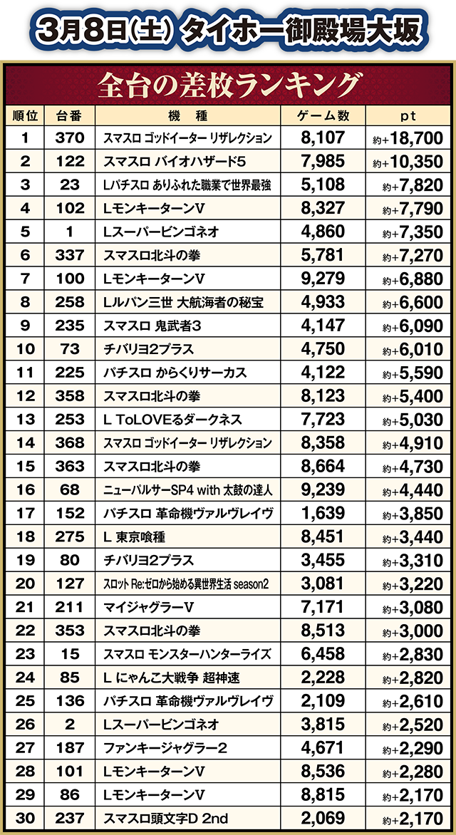 「L 東京喰種」の587番台や「L パチスロ シン・エヴァンゲリオン」の175番台、「チバリヨ2プラス」の577番台なども約+5,300ptオーバー。