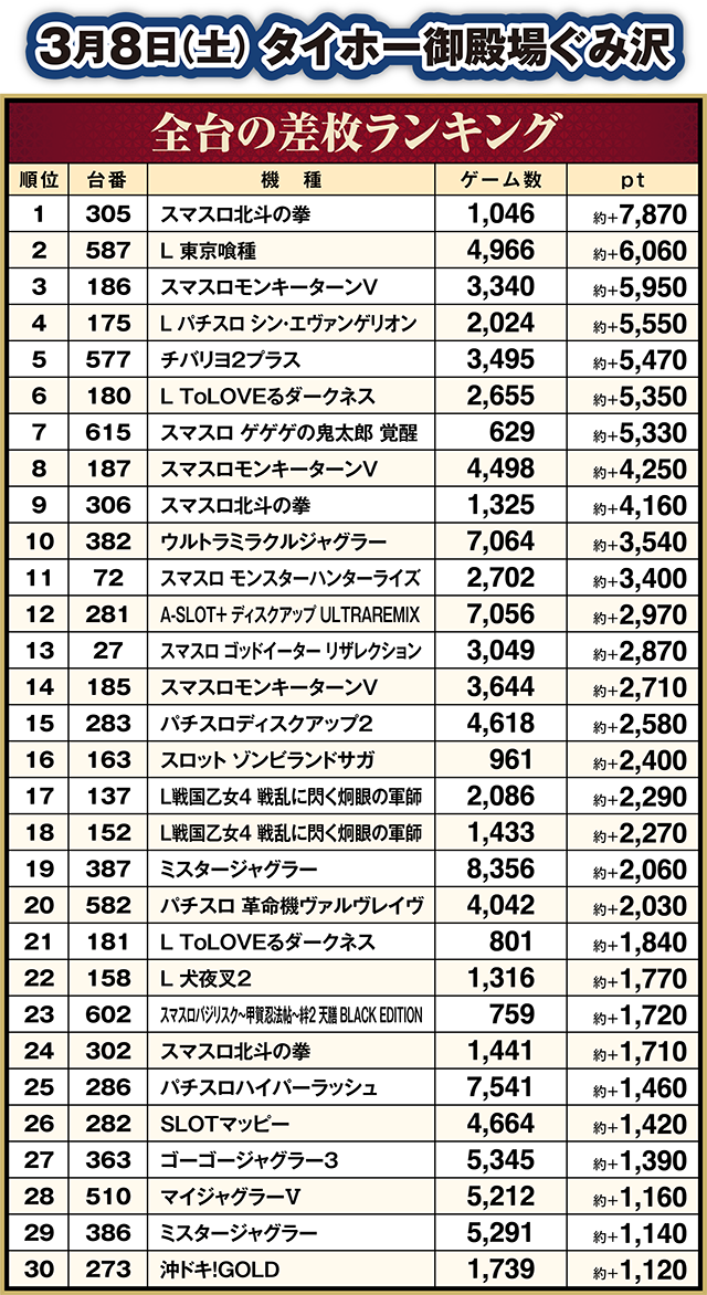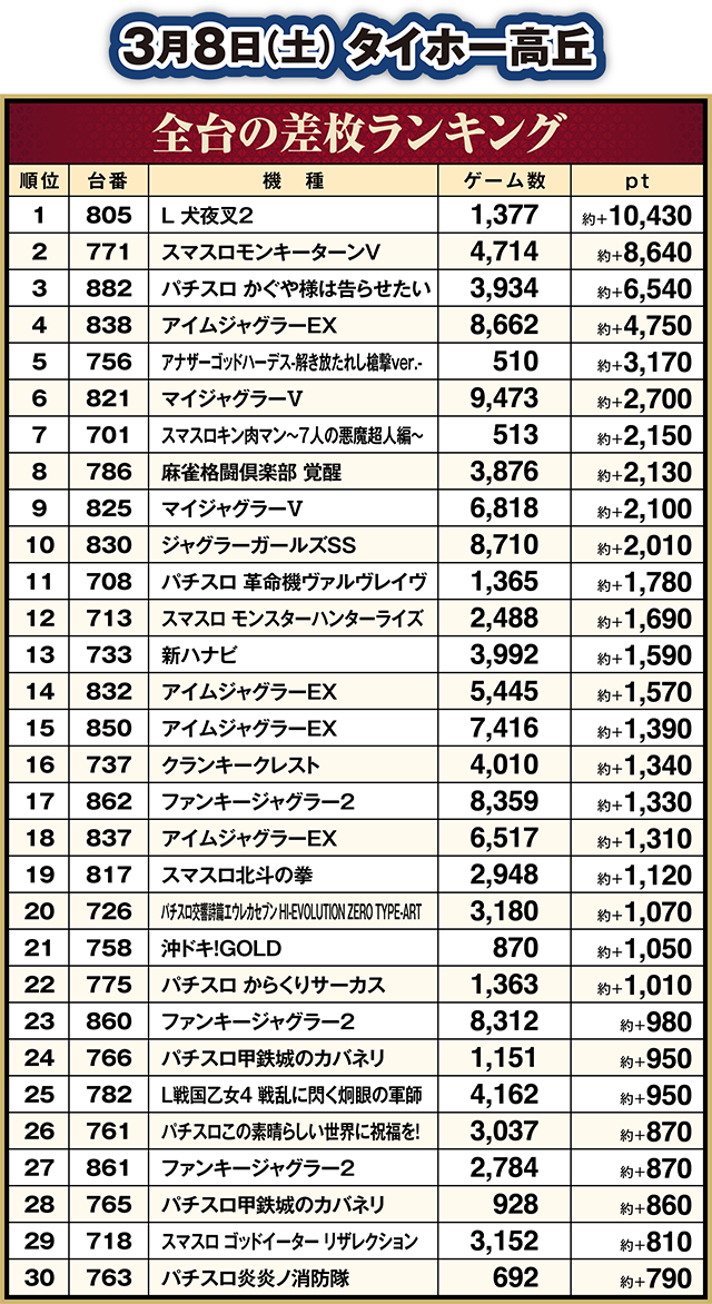 ボーナスが軸となる機種もにぎわっており、「アイムジャグラーEX」の838番台が約+4,750ptを記録した。