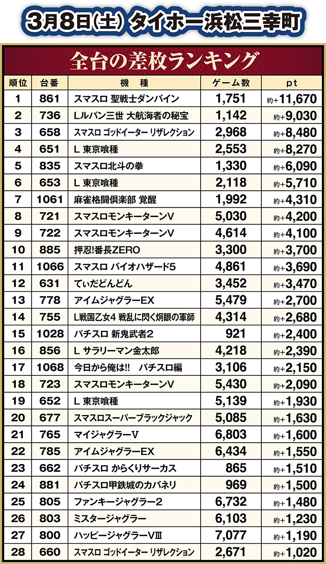 タイホー浜松三幸町も好結果を残した台が多く、「スマスロ 聖戦士ダンバイン」の861番台は約+11,670pt!!