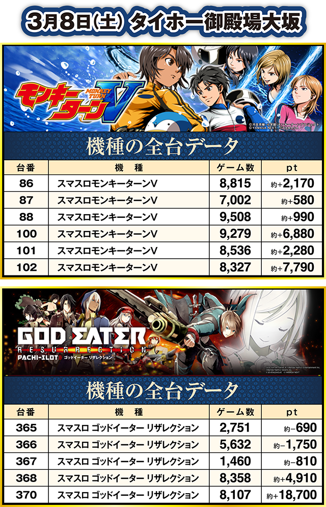 「スマスロ ゴッドイーター リザレクション」と「スマスロモンキーターンV」も複数台がプラスとなり、約+4,000ptを上回った台もあった。