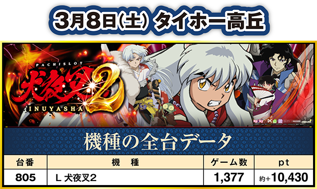 タイホー高丘で、約+10,000ptを超えたのが、805番台の「L 犬夜叉2」!