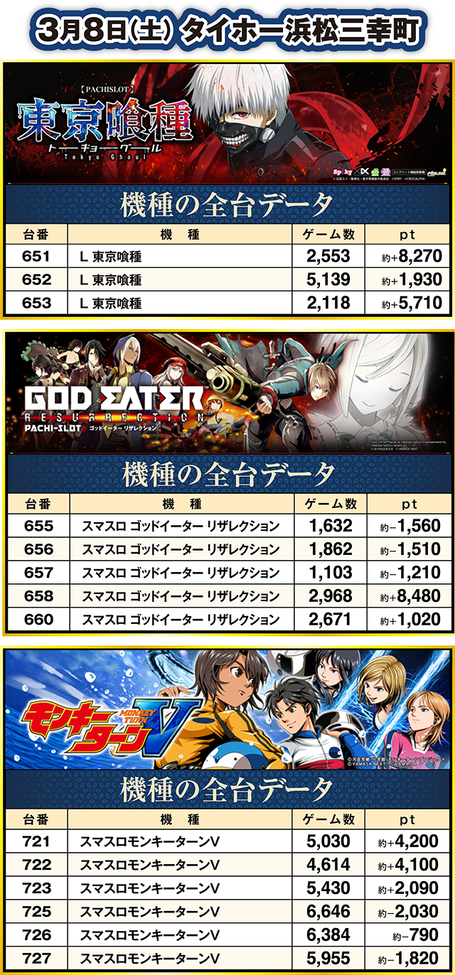 タイホー浜松三幸町では、「L 東京喰種」の全台が約+1,900pt以上となり、651番台は約+8,200ptを超えた。